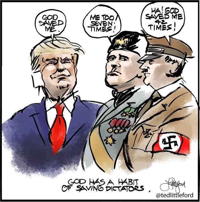 It is prideful and greedy indeed to claim that God saved one person for whatever purpose is invoked. Aside from knowing that Trump did in fact survive the attempt on his life, we know nothing more. It is just as plausible, especially knowing what we know about Hitler, that Trump was spared for reasons probably not as savory to his supporters. Perhaps he was kept alive as a grand example of the downfall of humans when greed and ignorance combine. One more example of the folly of invoking God’s will – the Civil War. Both the North and the South said that they were instruments of God in God’s holy purpose. Oddly enough they were both right just not in the way they thought.