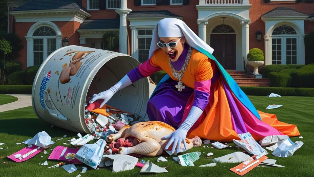 After the sun went down, and I knew Karoline had gone to bed- as I stopped hearing her bay at the moon, I ventured across the street. I had to remain unassuming and the cover of night was perfect. I decided to go through Karoline’s trash and write down everything I found. A light suddenly went on in her house, so rather than abort the mission since even a whiff of abortion on the air can send Justice Thomas into apoplexy, I wheeled the trash bin all the way back to the house I was staying in. I know what you’re thinking, “Sr. Organza, isn’t Alexandria completely across the Potomac from DuPont Circle?” Yes, my child. It is. But I was discreet. I still had my dress habit on under my ghillie suit and would you think anything of a nun dressed half in her habit and half in a ghillie suit wheeling a five foot tall trash can across a bridge at 2am with a children’s bicycle tied to her waist?